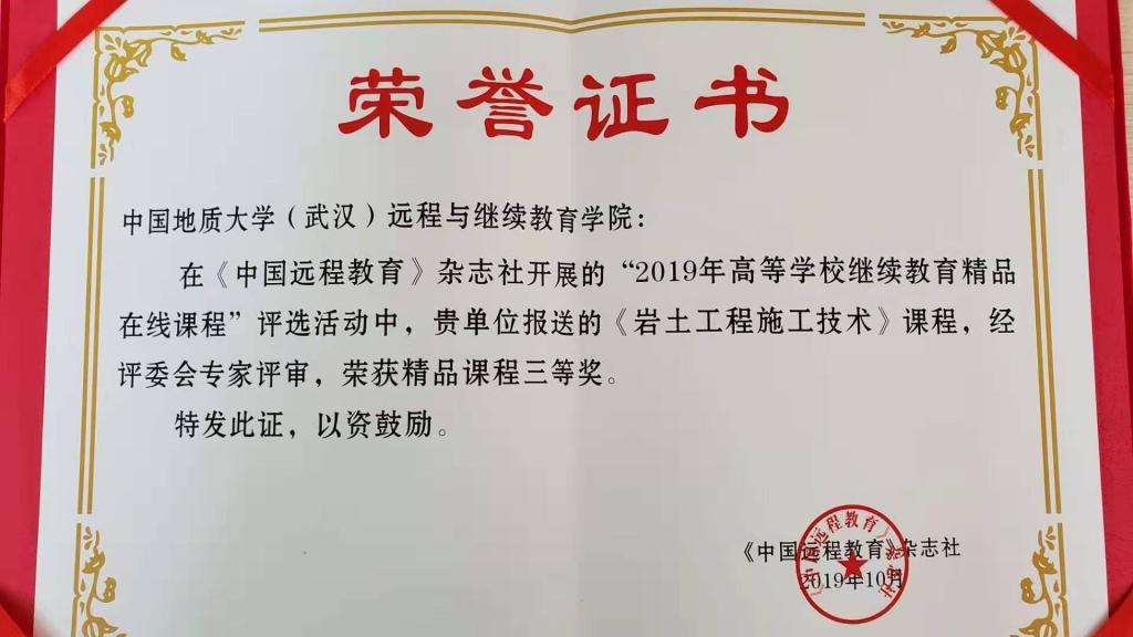 公司报送的《岩土工程施工技术》课程荣获“2019年高等公司继续教育精品在线课程”三等奖。公司荣获“2019年高等公司继续教育精品在线课程优秀组织奖”。